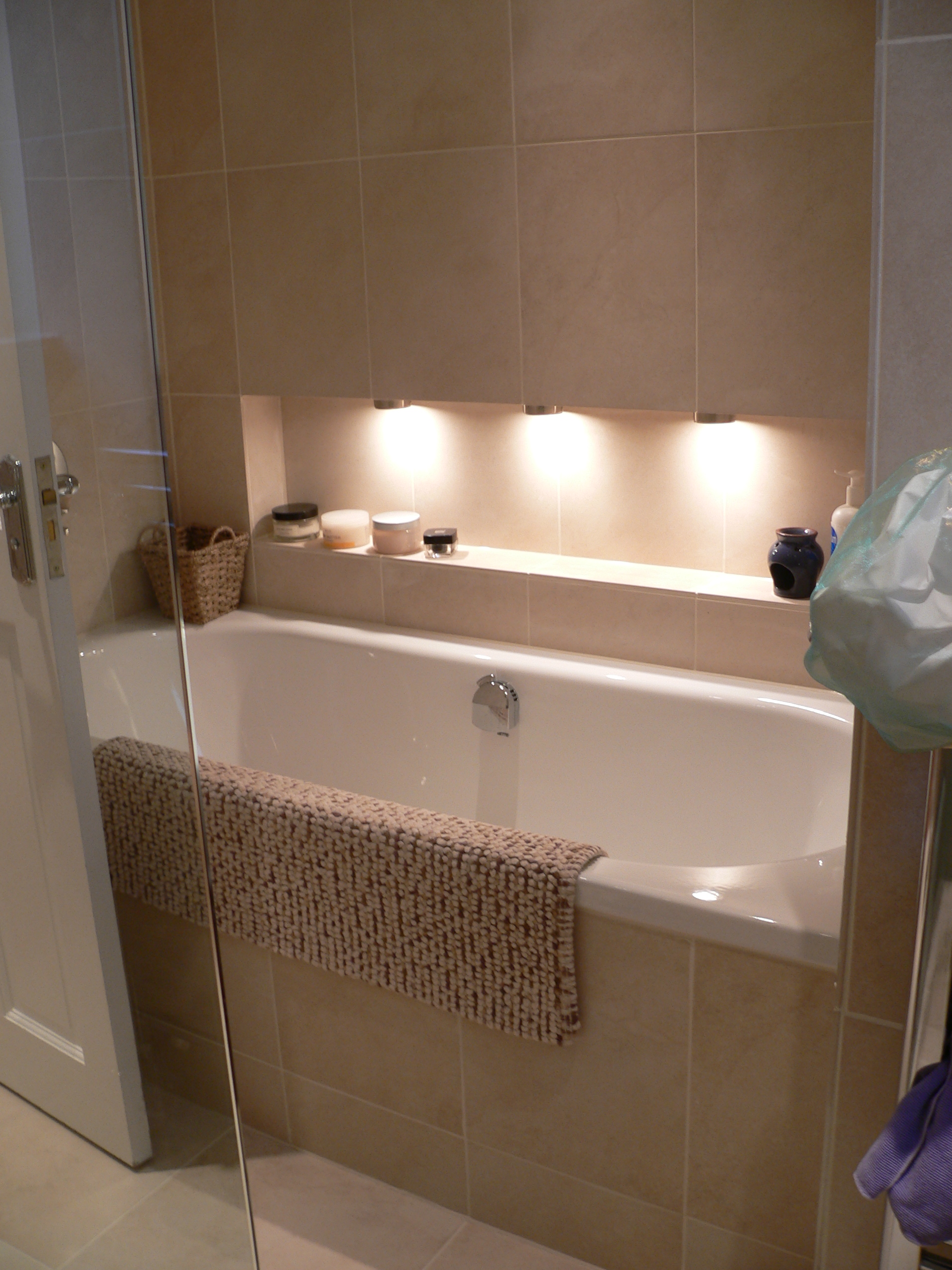 Bathroom in limestone with discreet lighting in addition to ceiling fixtures