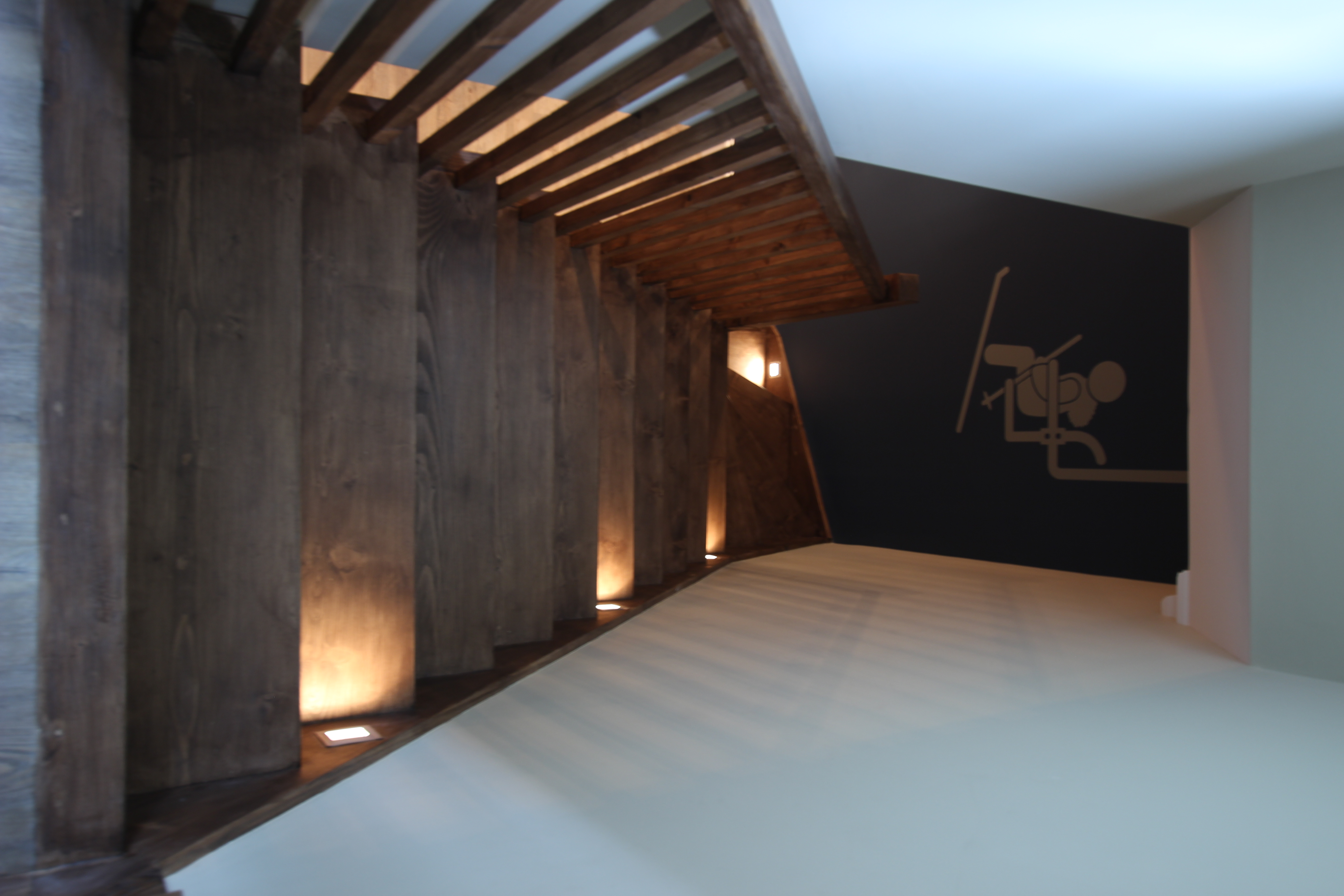 Optical illusion view of going down staircase and seeing ski lift mural